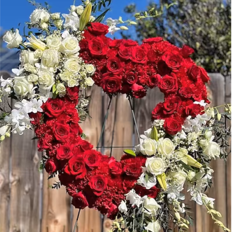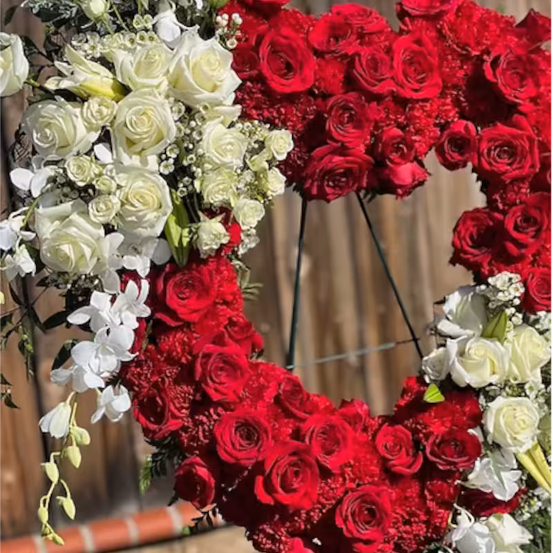 A vibrant red spray of red roses and red carnations designed into a heart shaped sympathy easel accented with white roses, orchids and lily sprays on alternating sides of the tribute spray. One last spectacular remembrance for that special someone.