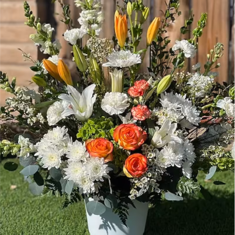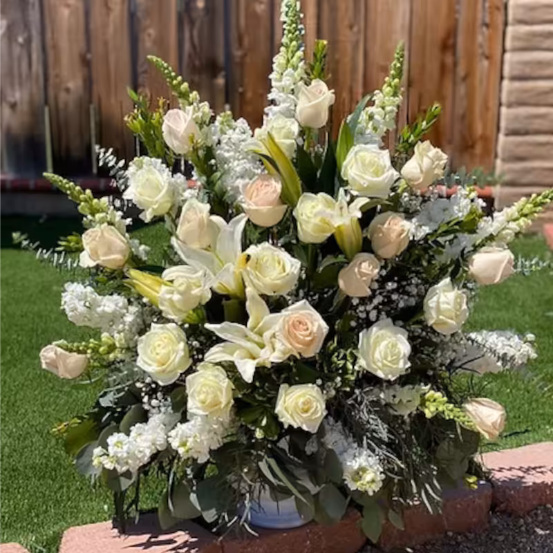 Sweet Sentiment Alter Arrangements – Customize your sitting alter arrangement with a variety of fresh florals, roses, lilies, snap dragons, gladioli, and cremones accented with a variety of eucalyptus folliage.