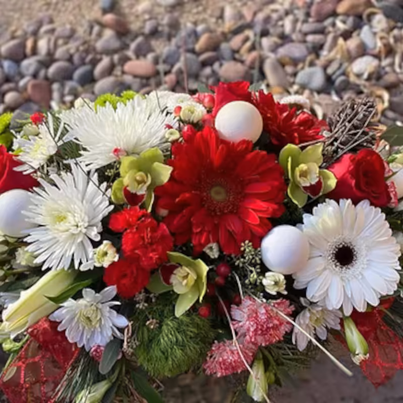 This long and low centerpiece is the perfect accent for your holiday table. We can customize your colors, ornaments and ribbon colors upon request.